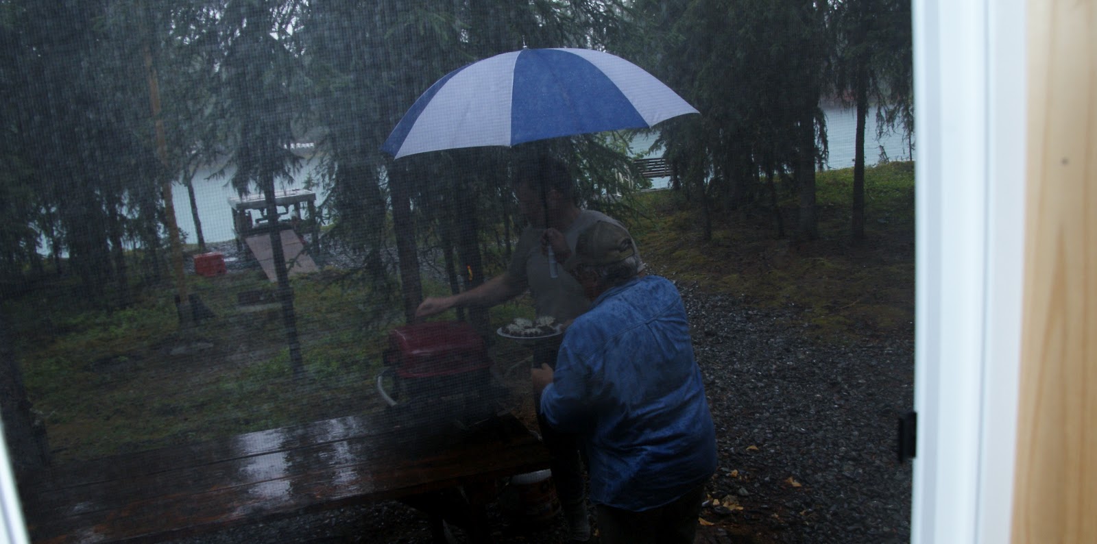 BLAKE GRILLING MY RED SALMON IN THE POURING RAIN AND HIM NOT CATCHING ONE…….PRICELESS!